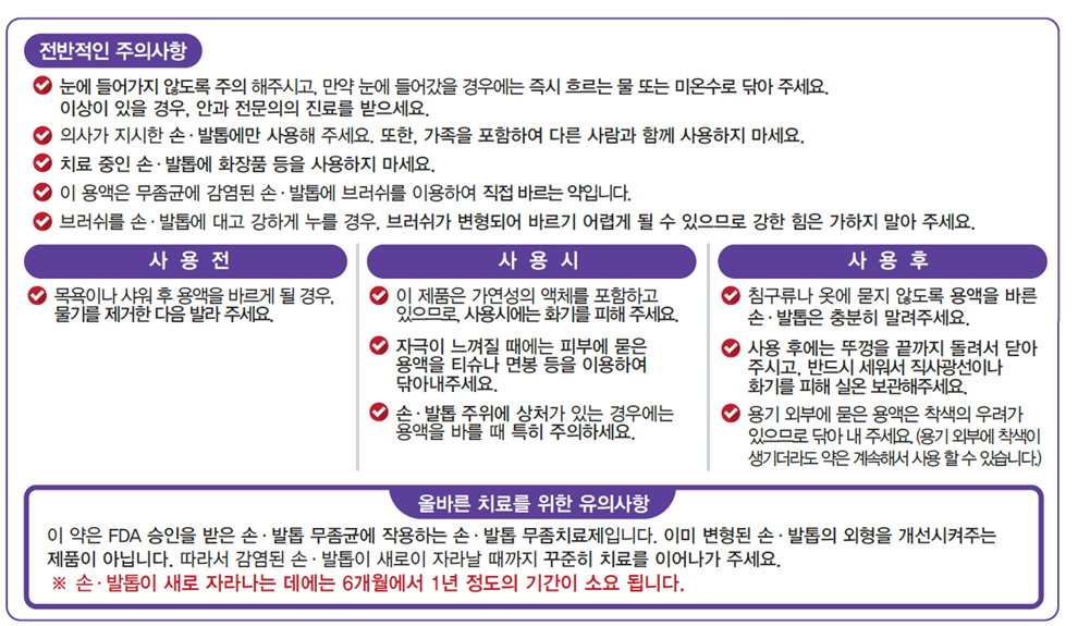 용액을 바른 손, 발톱은 충분히 말려야 합니다. 자기 전에 바르시고 5분 정도 말려주시고 주무시면 됩니다.