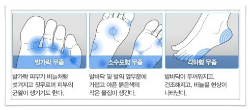 : 마른 무좀이라고도 하며, 발바닥에 두꺼운 각질이 생기고, 허물이 벗겨지고 갈라지면서 통증을 느끼게 됩니다. 가렵지도 않고 냄새도 없어서 무좀인지 모르고 지나치는 경우가 많습니다. - 치료