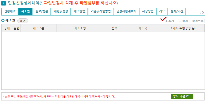 원료 추가 누르셔서, 원료명 검색하시고, 이에 따른 필수 값을 입력하시면 됩니다.