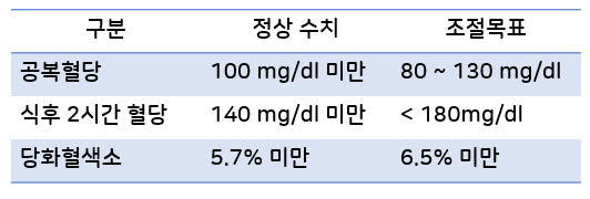 아래 표는 당뇨병의 여러 지표의 정상 수치와 조절해야 하는 목표입니다.