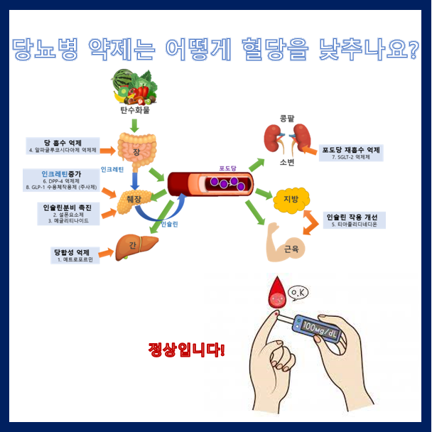 각각의 약물이 어디에 작용하여 혈당을 낮추는지 보시면 좋을 것 같습니다.