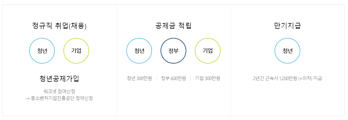 5인 이상 중소기업에 취업한 청년이 2년간 300만원을 적립하면, 정부가 600만 원, 기업이 300만 원을 공동 적립하여 만기 시 1,200만 원의 목돈 마련이 가능합니다!